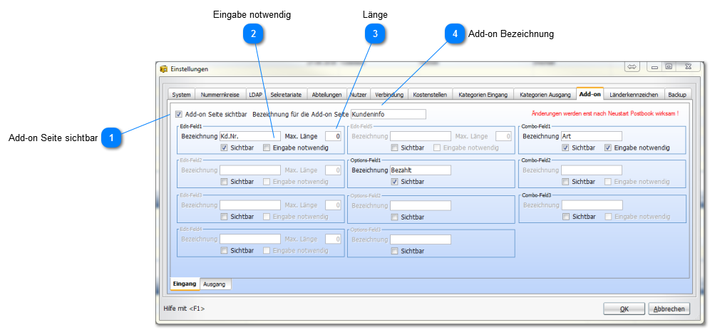 Postbook ermöglicht Ihnen, eigene Datenbankfelder zu definieren. Sie können 5 Editfelder (Texte) sowie 3 Optionsfelder (Ja/Nein) und 2 Combo-Felder (Auswahlliste) definieren, um zusätzliche individuelle Informationen in der Datenbank abzuspeichern.